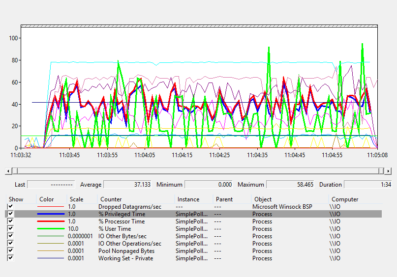 Here’s the graph for the traditional UDP server. Note the thick blue line, that’s the amount of time the process spends in kernel mode, on average 37.133% of its time.